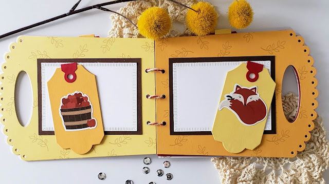 I would like to place a picture of Leon in the white area, there I used the crimped frame die from the Greetery and matted it with dark chocolate card stock. All the tags are used with the die Tag Sale #6 die. On one side I used a sticker and the other side is blank to do some journaling. On the first and second page you can see that the tag slides from the top underneath the crimped frame die.